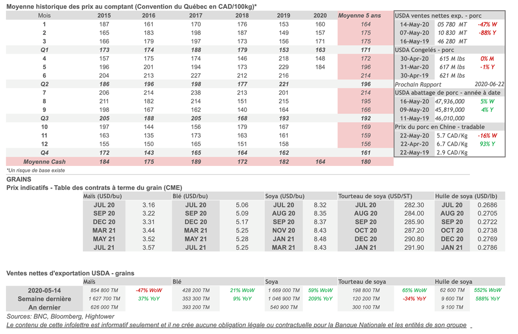 • Les prix des grains sont en baisse ce matin; les tensions se sont intensifiées après que la Chine ait annoncé son intention d'imposer une loi sur la sécurité nationale à Hong Kong, et les analystes craignent que l'aggravation des relations entre la Chine et les États-Unis puissent affecter les achats de produits agricoles américains dans le cadre de leur accord commercial.