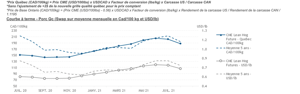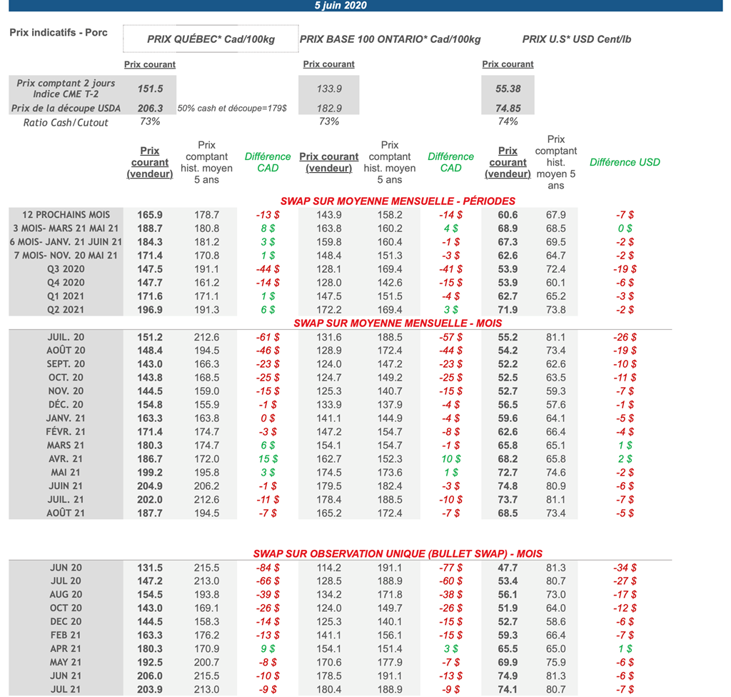 Voici les prix les plus récents sur le marché du porc et des grains:
