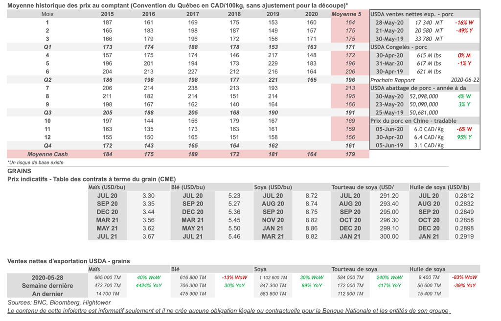 • Malgré la nouvelle en début de semaine comme quoi la Chine suspendrait les achats de soya U.S. de ses compagnies d'États, le South China Morning Post rapporte que les acheteurs chinois sont demeurés actifs sur le marché. Selon les données de l'USDA, ceux-ci ont acheté, au cours de la semaine se terminant le 28 mai, 200 984 tonnes de soya U.S. à être livrées avant septembre 2020 et 264 000 tonnes de la prochaine récolte. Cela représente plus de 100M de dollars U.S. d'achats selon le représentant américain en commerce Robert Lighthizer.