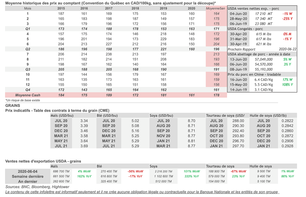Voici les prix les plus récents sur le marché du porc et des grains: