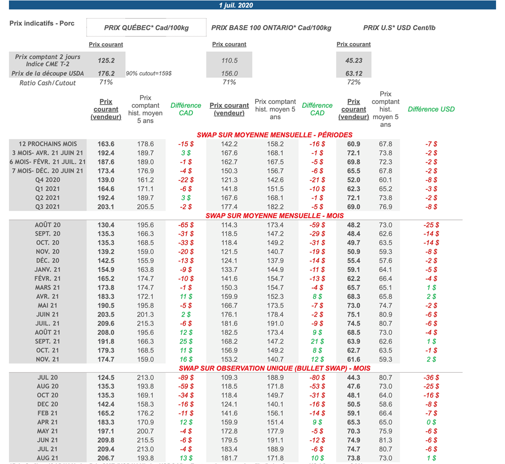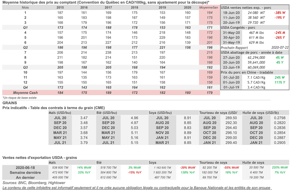 • Les prix des contrats de porc étaient en hausse hier pour une 2e journée consécutive, à l'exception de juillet 2020 en retrait de 0,2 cent USD/lbs.