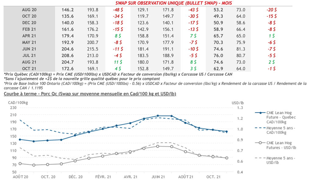 • Les contrats de porc ont terminé la journée de vendredi en baisse pour les échéances d’août, octobre et décembre 2020. Les contrats des échéances à plus long terme ont clôturé en légère hausse.