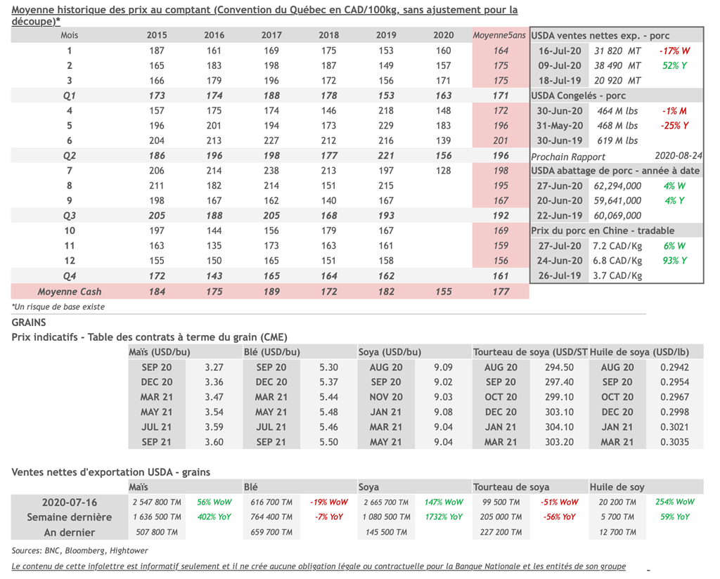 • Selon l'agence Hightower, certains "traders" ont fait part de leur inquiétude quant à l'escalade des tensions entre les États-Unis et la Chine, avec les fermetures des consulats de Houston et de Chengdu la semaine dernière, et de l'impact que celles-ci pourraient avoir sur la demande chinoises en importations de porc U.S. Nous surveillerons de près les ventes nettes d’exportations de porc U.S. ce jeudi.