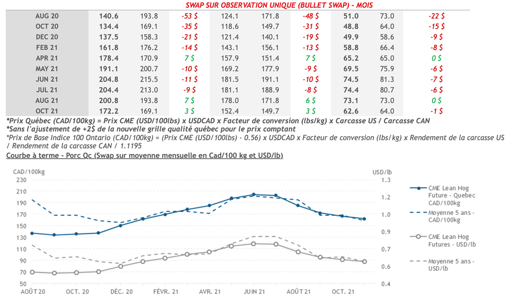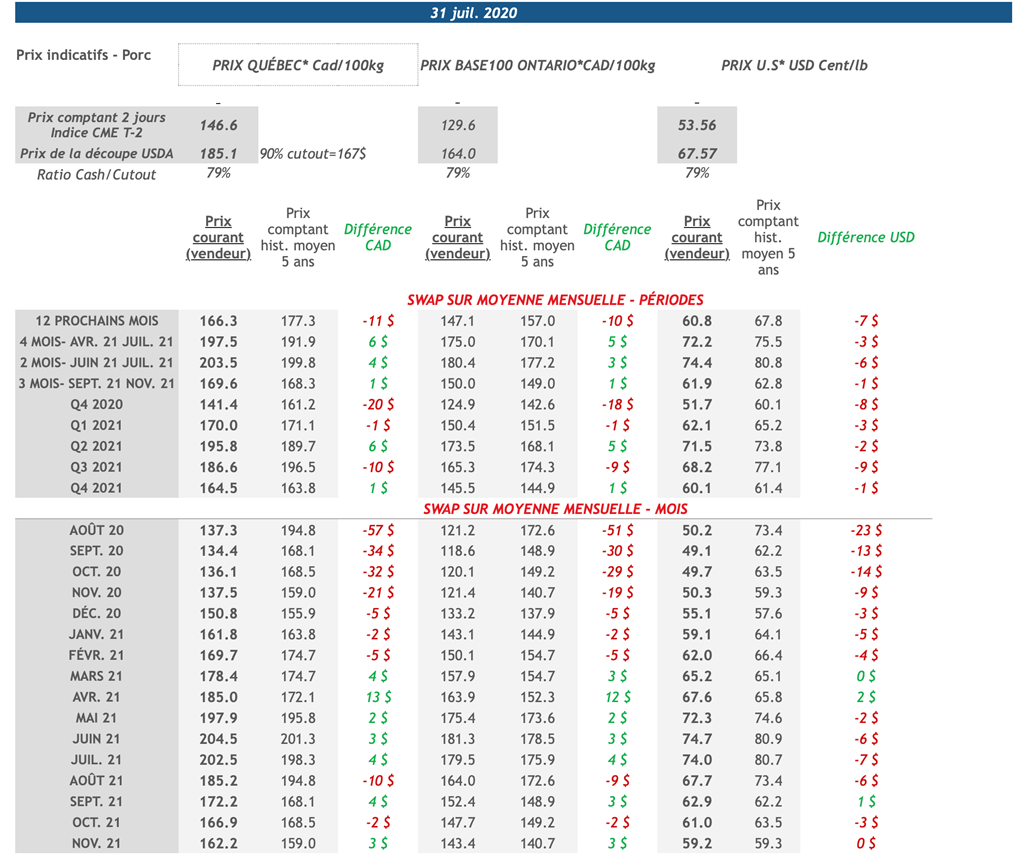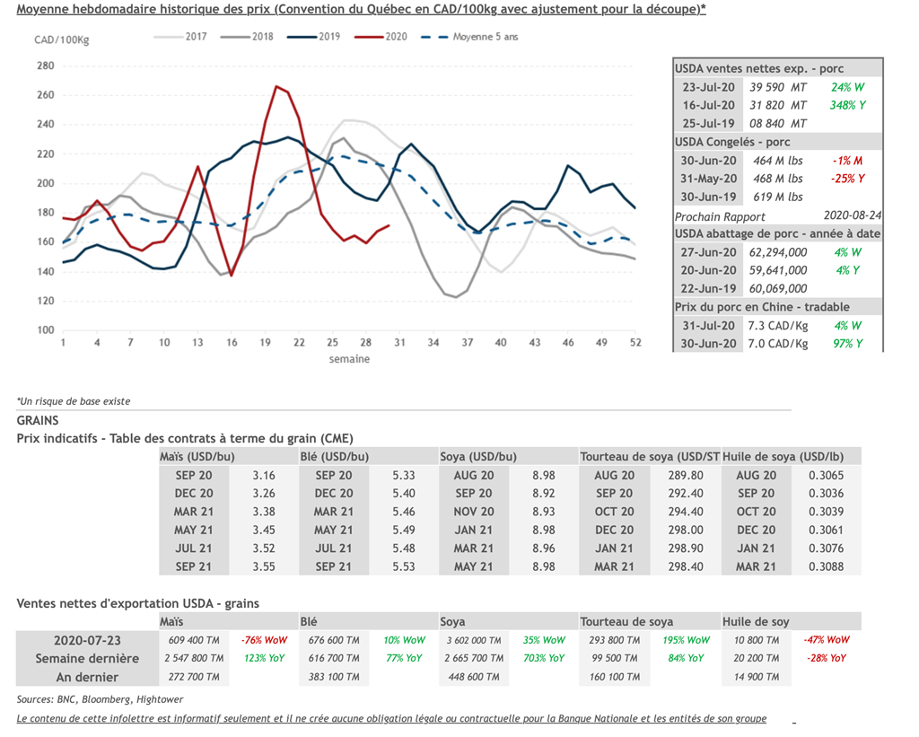 • Les contrats de porc étaient en baisse pour toutes les échéances hier. Les contrats d'août, octobre et décembre 2020 ainsi que le contrat d'octobre 2021 ont perdu plus de 1 cent USD/lb. Depuis lundi, le contrat actif de porc (octobre 2020) a perdu 2,425 cents USD/lb (-4,8%).