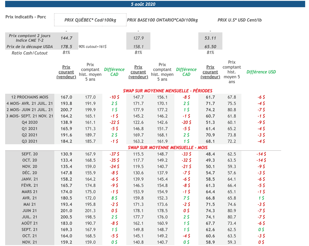 • Les contrats de porc ont terminé la journée en baisse hier pour la plupart des échéances, à l'exception des contrats d'octobre et de décembre 2020. Les pertes et les gains ont été moins de 1 cent USD/lb.