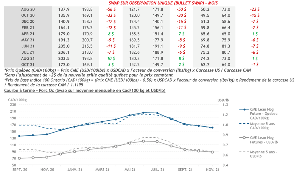 • Après avoir terminé la journée de mercredi avec un gain de 1,54 cent USD/lb, l'indice découpe de porc U.S. a continué sa progression hier et s'est établi à 70,80 cents USD/lb avec un gain de 3,76 cents USD/lb (+5,6%). Toutes les coupes étaient en hausse sauf la longe. Le jambon s'est apprécié le plus, allant à 56,90 cents USD/lb avec un gain de 9,18 USD cents/lb (+19,2%).