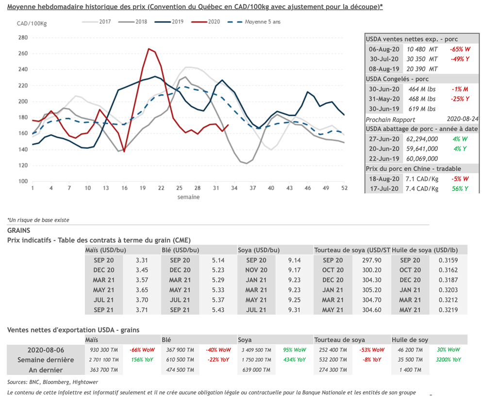 • 20 août: USDA — Ventes nettes d’exportations pour les grains et le porc