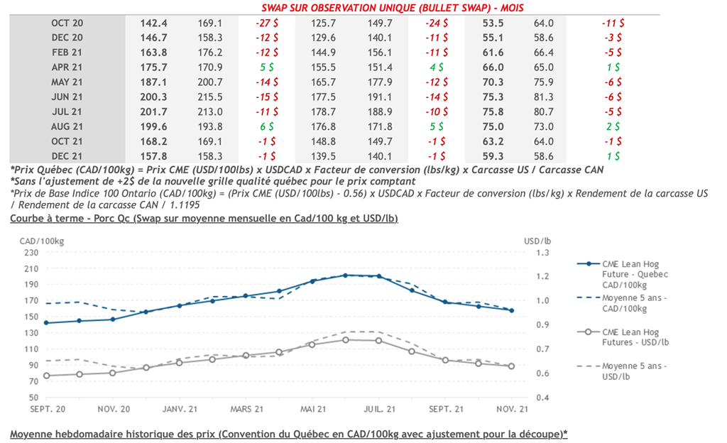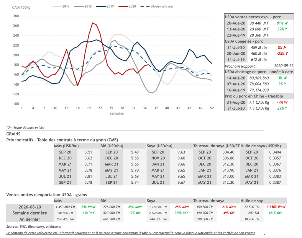• Les contrats de porcs ont terminé la journée en baisse pour toutes les échéances vendredi. Les contrats d'octobre et de décembre 2020 ont clôturé à 53,65 et 55,20 cents USD/lb avec des pertes de 2,075 (-3.72%) et 1,375 (-2.43%) cents USD/lb respectivement. Les pertes ont été de moins de 1 cent USD/lb pour le reste des échéances.