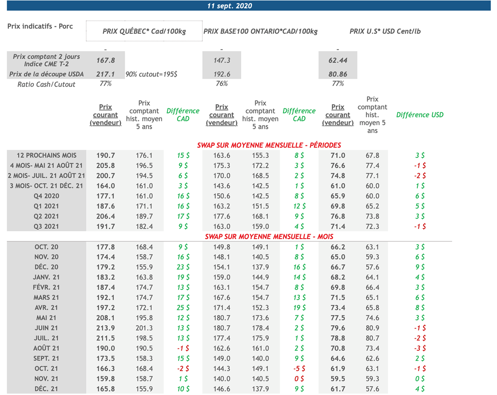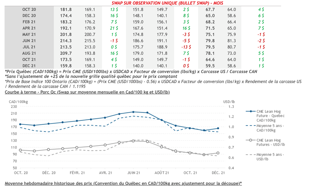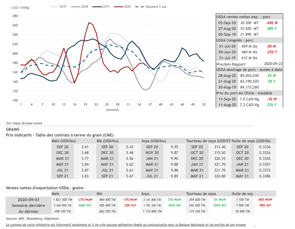 • La tendance haussière sur les contrats de porc s'est poursuivi hier alors que toutes les échéances étant en hausse. Les échéances d'oct-20, déc-20 et fév-21 ont toutes atteint le "limit-up" de +3 cents USD/lb.