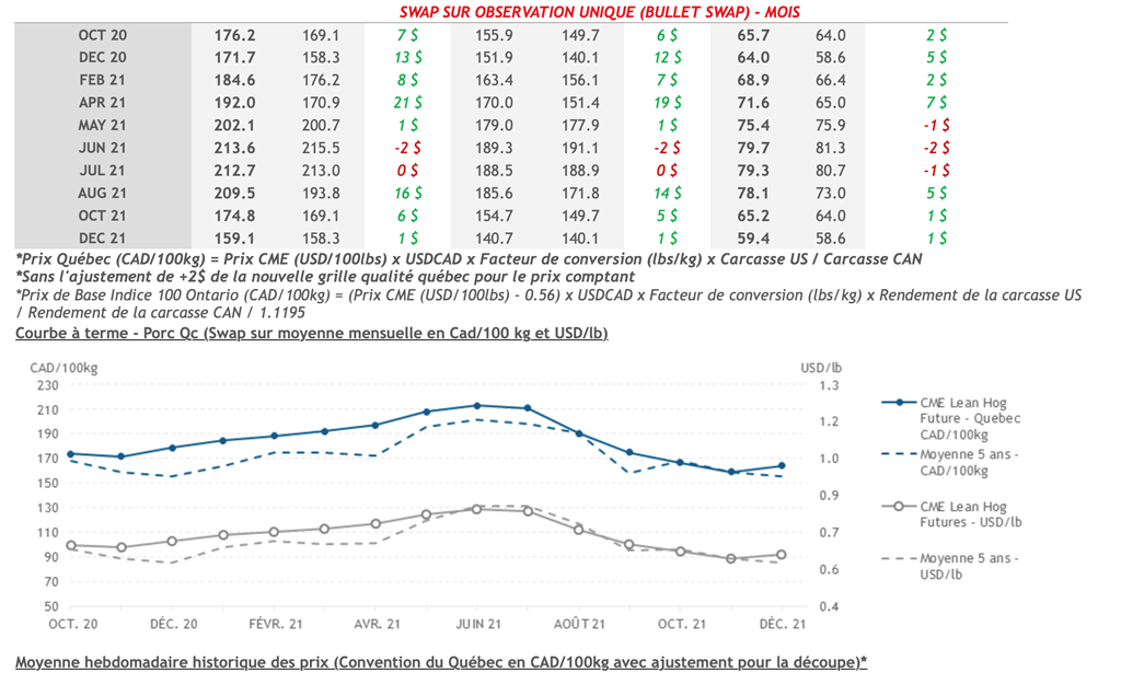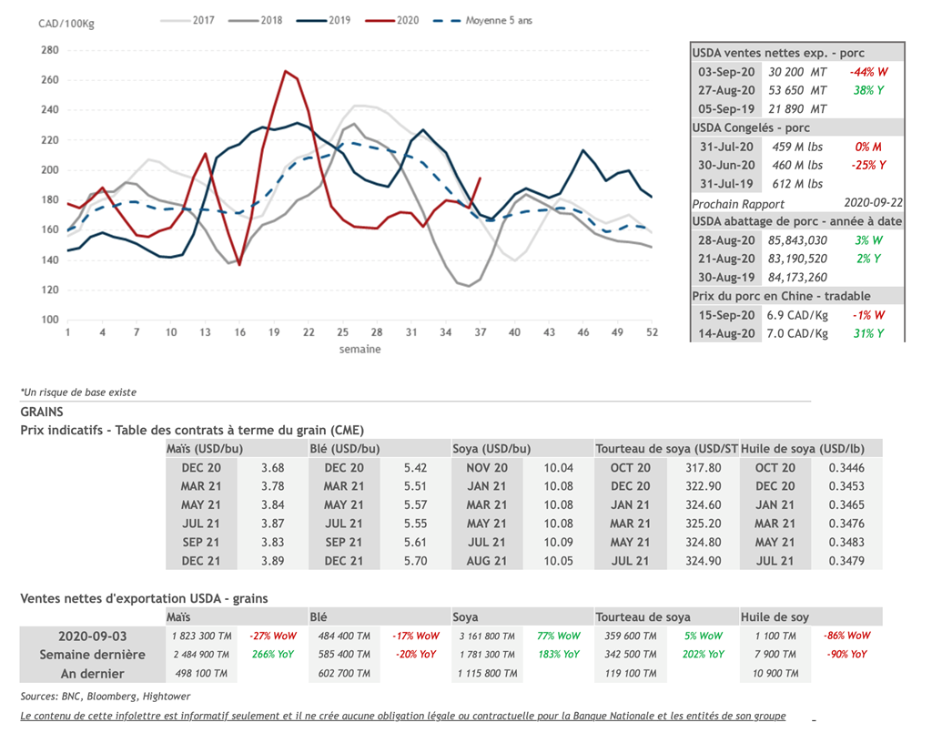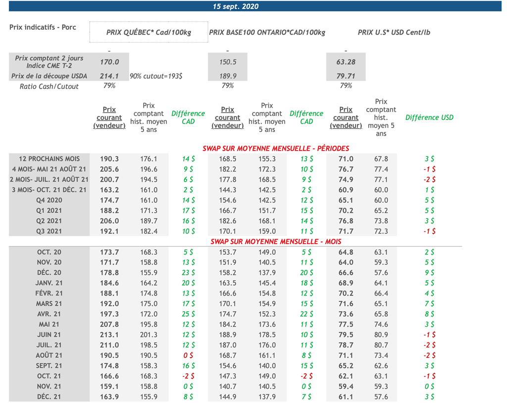 • Décision de la Régie des marchés agricoles et alimentaires du Québec (RMAAQ) : La RMAAQ a rendu sa décision le 14 septembre quant à la formule prescrite par la convention 2019-2022 (fenêtre 90-100% du cutout). Pour la période du 15 septembre au 31 décembre, la formule demeurera la même avec la clause qui fait en sorte que lorsque le prix du rapport LM_HG201 de l'USDA (cash) est inférieur à 65% du prix du LM_PK602 (cutout), le prix du cutout doit être ajusté pour que ce ratio atteigne 65%.