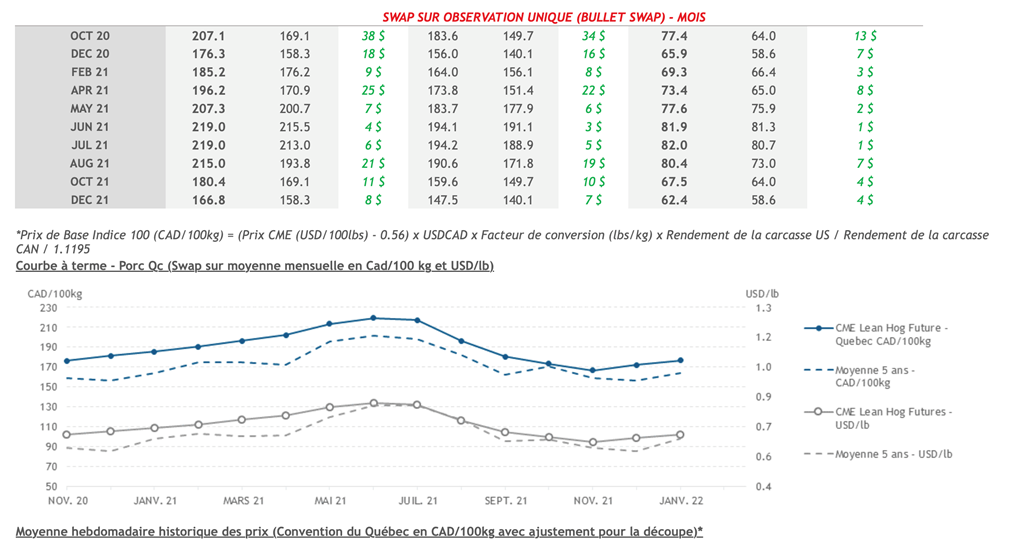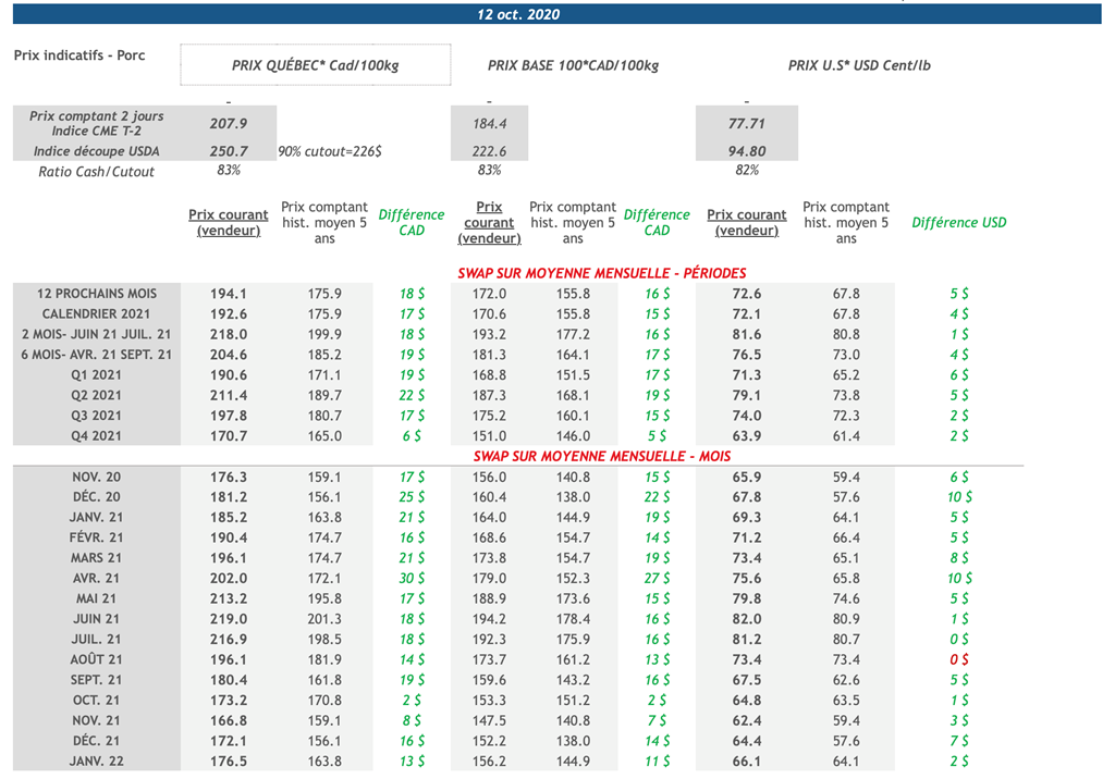• Les valeurs de la découpe de porc aux États-Unis et des carcasses de porcs maigres semblent s'être stabilisées, s'établissant respectivement à 94,80 et 77,71 cents US/lb. La demande chinoise de porc aux États-Unis a été forte ces dernières semaines, ce qui apporte un support intéressant et cela devrait rester au cours des deux prochains mois, ce qui maintiendrait l'offre de porcs U.S. serrée.