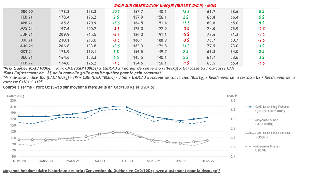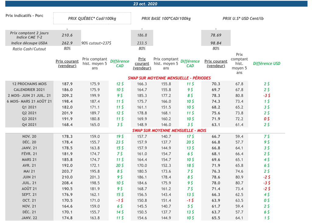 • Les contrats de porc étaient une fois de plus en repli hier à l'exception des échéances de décembre 2021 et de février 2022. Les échéances à court terme ont écopé le plus hier avec le contrat de décembre 2020 terminant la journée à 66,20 cents US/lb avec un recul de 3 cents US/lb (limite baissière). Les échéances de février et avril 2021 ont également eu des pertes supérieures à 1 cent US/lb.
