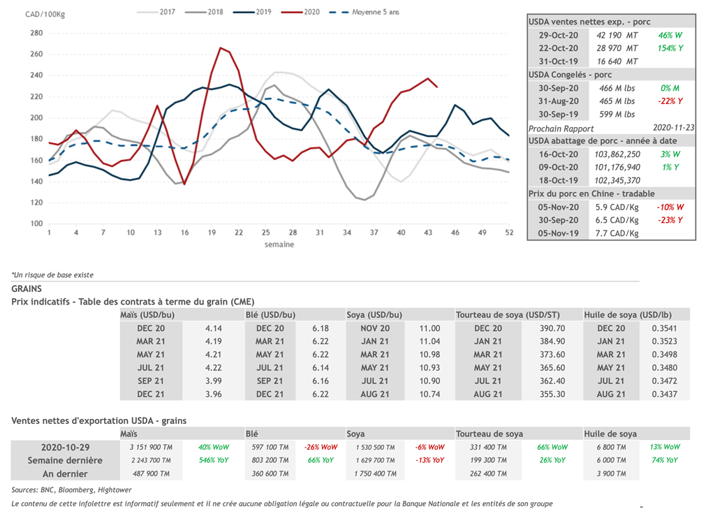 • 13 novembre : USDA — Ventes nettes d’exportations pour les grains et le porc