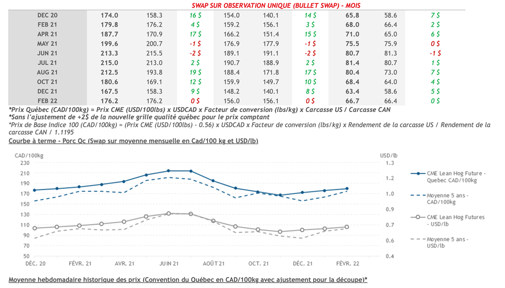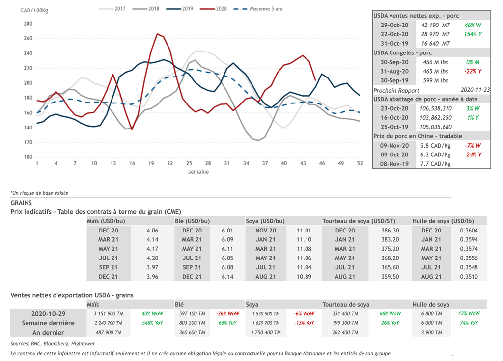 • La journée de vendredi s'est terminée avec un repli pour les contrats de porc de déc-2020, fév-21 et avr-21, mais la tendance haussière s'est maintenue pour les prix des échéances à plus long terme. Le contrat de déc-20 a perdu le plus en terminant la journée à 64,90 cents US/lb, en baisse de 2,5 cents US/lb (-3,7%). Les prix des contrats de mai à août 2021 n'ont toujours pas rattrapé le sommet atteint à la mi-octobre, bien que l'échéance d'août s'en rapproche de plus en plus.