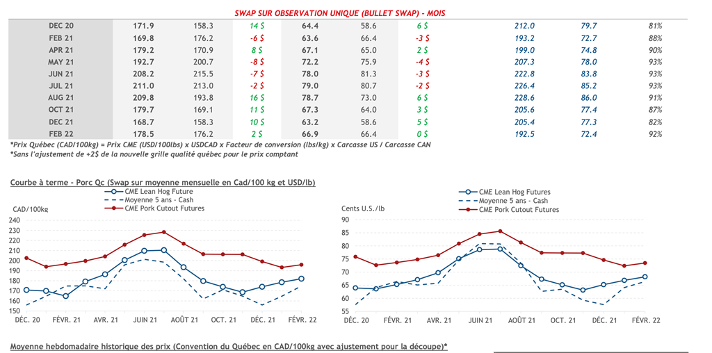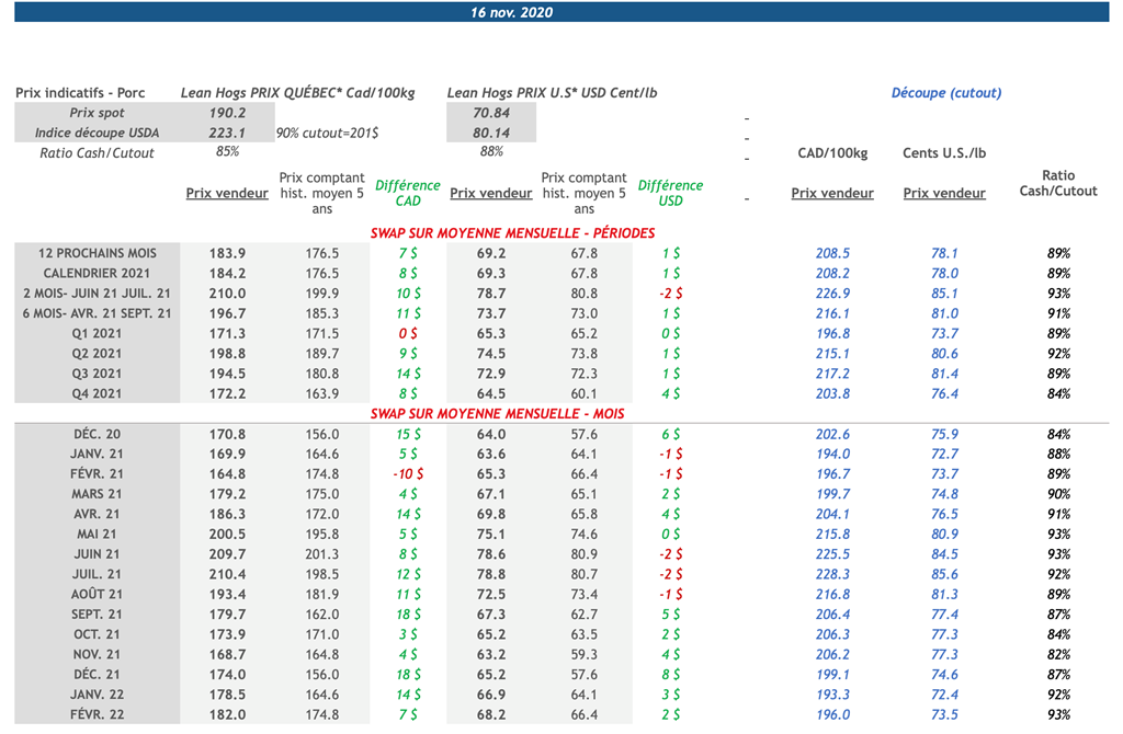 • Les contrats de porc ont terminé la journée dans le rouge vendredi pour toutes les échéances. Les contrats avec les échéances les plus rapprochées ont clôturé à leur plus bas niveau depuis le début du mois de septembre avec les contrats de décembre 2020 et février, avril, juin, juillet et août 2021 écopant tous d'une perte supérieure à 2 cents USD/lb. Le contrat de mai 2021 n'était pas loin derrière avec une perte de 1,80 cents USD/lb.