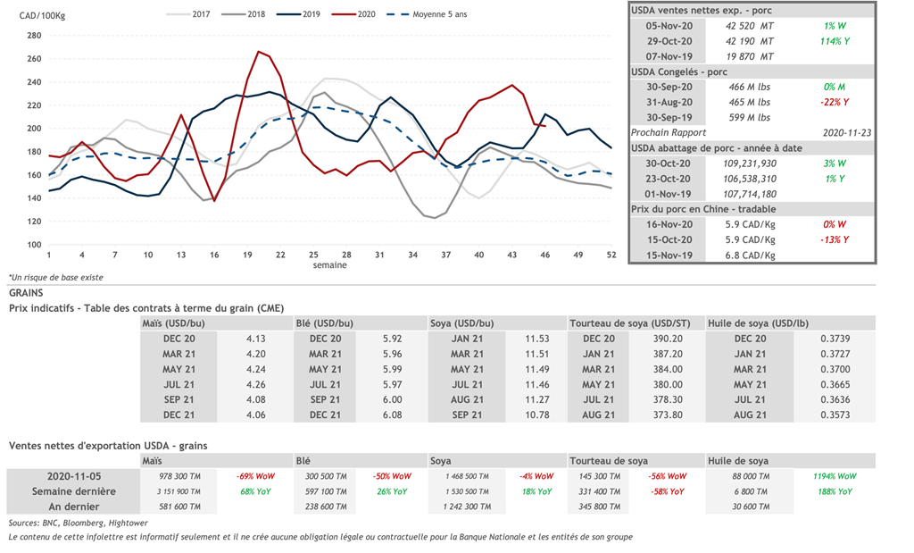 • Bien que le nombre de porcs abattus aux États-Unis était en baisse la semaine dernière et que les ventes nettes d'exportation aient été satisfaisantes, il semble que la pandémie laisse croire aux analystes que des perturbations de la chaîne de production porcine soient encore possibles aux États-Unis. S'il y avait une perturbation de la chaîne, le nombre de porcs en attente d'être abattu pourrait augmenter de nouveau et faire pression sur les prix.