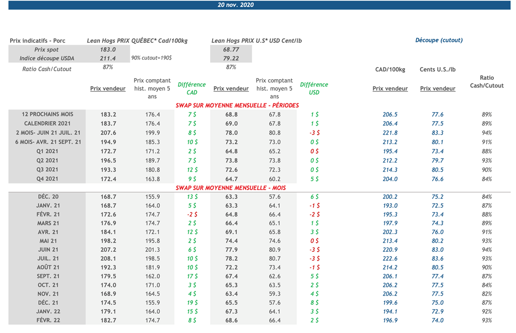 • La découpe a terminé la journée à 79,22 cents US/lb (+1,54 cents US/lb). Malgré cela, la découpe demeure en baisse de 3,86 cents US/lb (-4,6%) par rapport à jeudi dernier. Les grands perdants de la semaine sont le flanc (belly), le jambon et la longe avec des pertes de 13,04 (-12,6%), 5,49 (-8,5%) et 4,25 (-5,04%) cents US/lb respectivement.