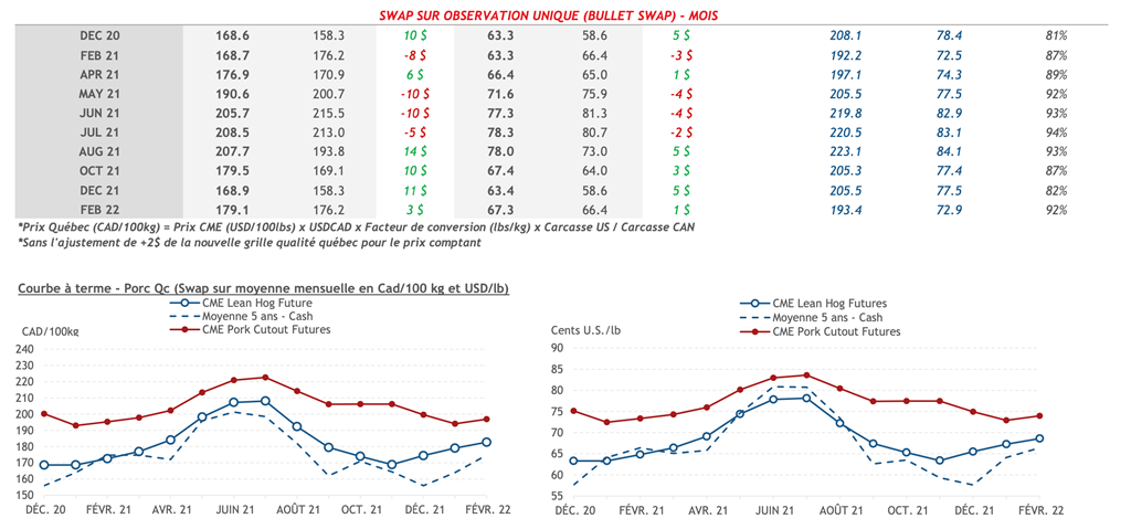 • Les ventes nettes d’exportations se sont fait ressentir dans le marché hier. Les prix des contrats de porc qui ont tous terminé dans le rouge hier affichant des pertes frôlant 3 cents US/lb sur certains mois.
