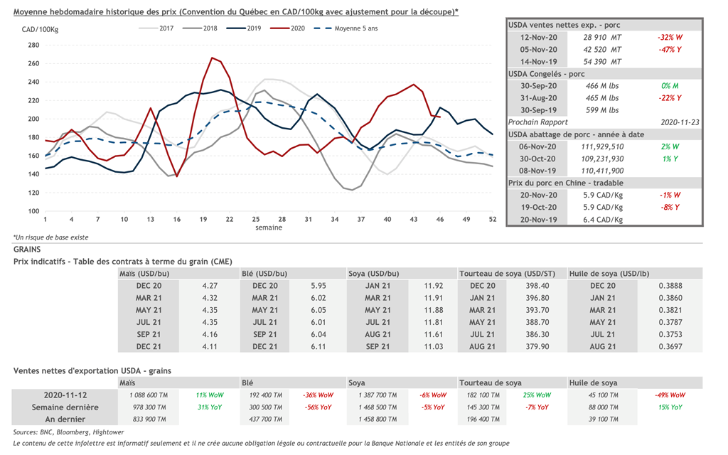 • Malgré un climat plus clément pour le soya au Brésil, le marché continue d'anticiper une forte demande de la Chine pour la légumineuse. Ce matin, les prix des contrats à terme sur le soya continuent de grimper et sont à quelques sous à peine du seuil de 12 USD/boisseau pour les échéances de janvier à juillet 2021. La demande chinoise rajoute de la pression sur les inventaires mondiaux en soya. Cela se reflète également dans l'huile de soya qui s'échange à son plus haut en 6 ans.
