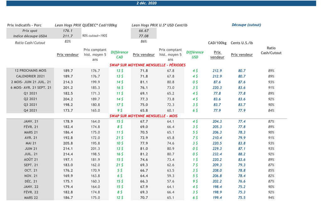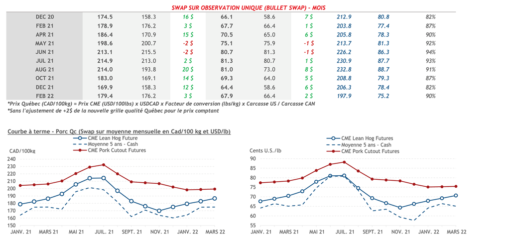 • L'indice cash de porcs CME maintient sa tendance, actuellement en baisse à 66,81 cents US/lb, mais reste à peu près 10 cents US/lb supérieur à la moyenne 2015-2020 pour cette période de l'année et 5 cents supérieur à 2017 qui était la meilleure année pour cette même période.