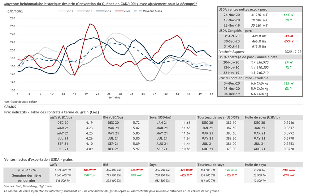 • Des procédures rigoureuses de test pour détecter la Covid-19 dans les cargaisons de viande congelée importées ainsi que le descente des prix local du porc en Chine pourrait faire en sorte que les importations chinoises de viande, incluant le porc, baissent de 30% en 2021 selon Bric Agriculture Group.