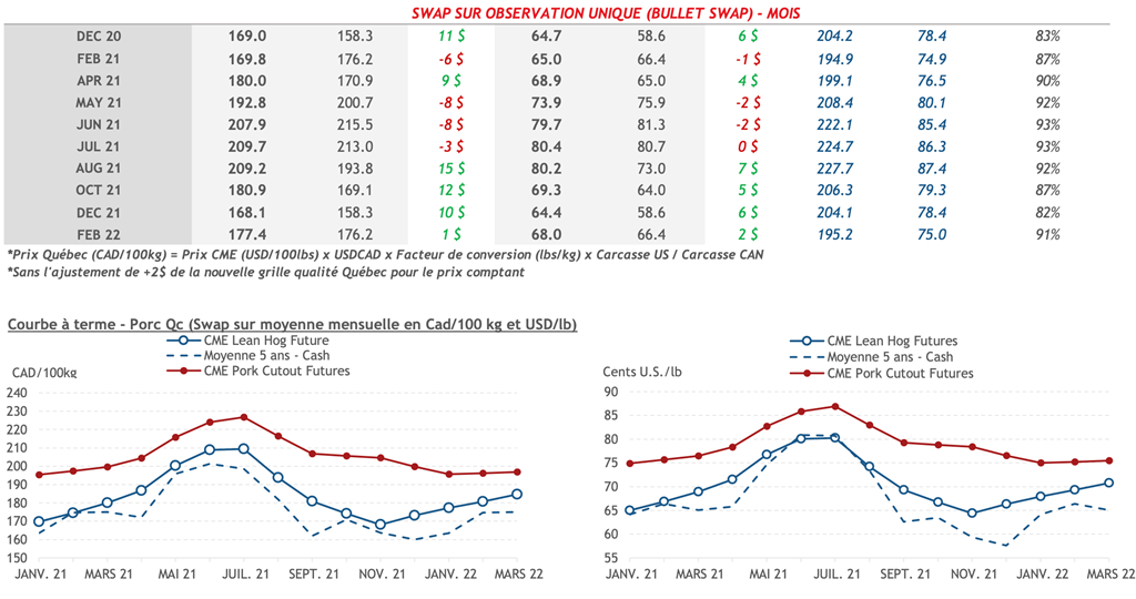 • L’indice de la découpe de porc U.S. a terminé la semaine à 78,17 cents US/lb vendredi avec un gain de 1,72 cent US/lb. Le prix se maintient donc à un niveau similaire à celui observé depuis la mi-novembre. Le prix de l’indice cash CME est demeuré près des 66 cents US/lb durant la semaine sans pour autant descendre sous ce niveau.