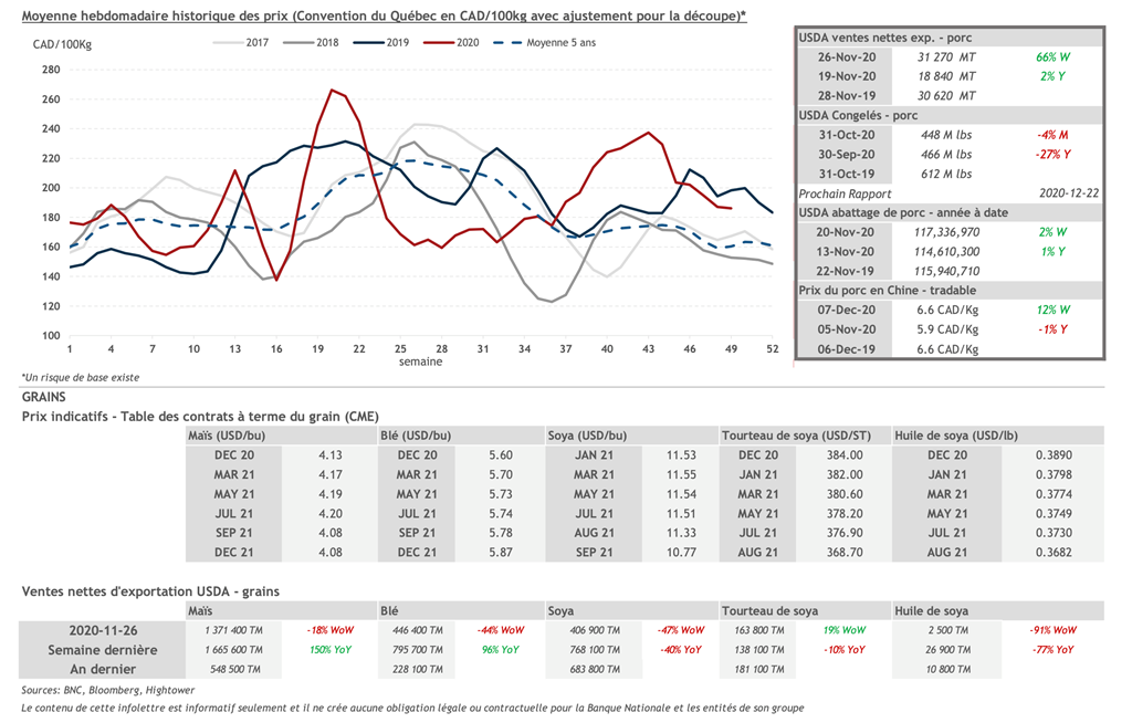 • Les contrats de porc étaient en baisse vendredi pour une troisième journée d’affilée pour les échéances de décembre 2020 à août 2021 à l’exception du contrat d’avril 2021 qui a terminé la journée avec un léger gain.