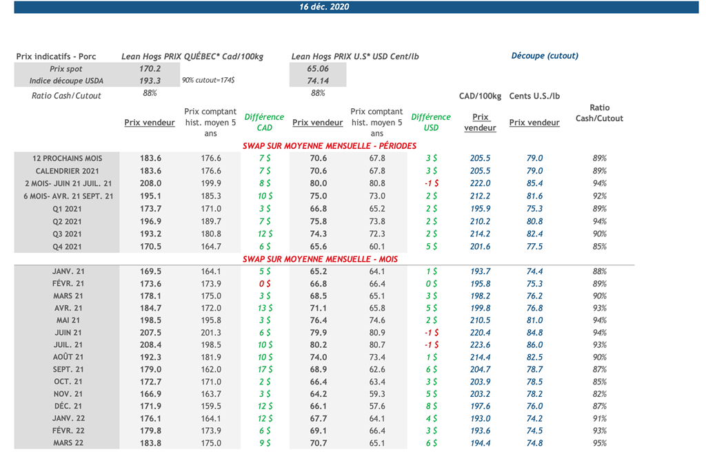 • L’indice de la découpe de porc U.S. a terminé la journée à 74,14 cents US/lb hier avec une perte de 2,89 cents US/lb (-3,75%). La découpe était en baisse pour une deuxième journée consécutive et se retrouve sous le cap des 75 cents US/lb pour la première fois depuis septembre. Le prix du jambon a chuté de 14,81 cents US/lb (-16.7%) et a contribué le plus à la baisse du prix de la découpe observé hier.
