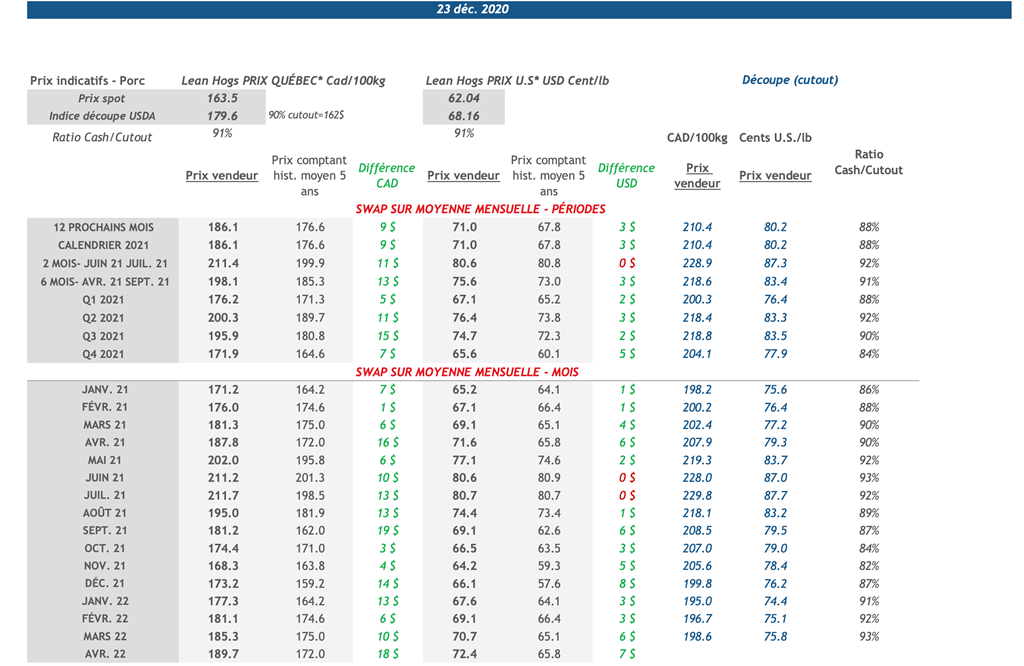 • Le rapport d'hier de l'USDA indique que les inventaires de viande congelée de porc étaient de 414,1M de livres à la fin du mois de novembre. Les stocks ont donc chuté de 33M de livres mois sur mois (-7,4%) et de 24,3% par rapport à novembre 2019. Les congelés sont à leur plus bas niveau depuis 2010.