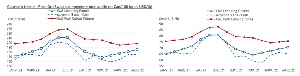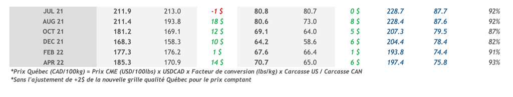 L’indice de la découpe de porc U.S. était également en forte baisse hier. Après un léger gain lundi, le prix de la découpe s’est établi à 68,19 USD/100lbs avec une perte de 4,18 USD/100lbs (-5,8%). Depuis août, c’est la première fois qu’on observe le niveau du prix de la découpe aussi bas. Ce sont surtout les forts replis du jambon et du flanc (belly) qui ont fait chuter la découpe. Le jambon et le flanc se sont établis à 85,41 et 53,83 USD/100lbs avec des pertes de 7.85 (-12,7%) et 10.95 (-11,4%) USD/100lbs respectivement.