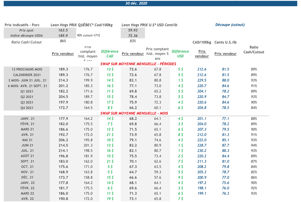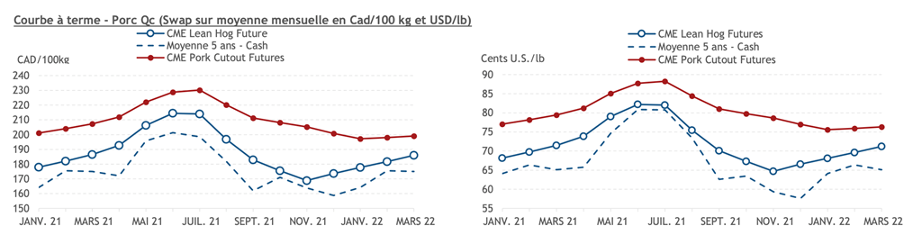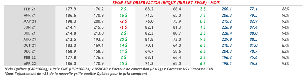 • Les contrats de porc étaient en légère hausse hier pour toutes les échéances. Les gains se sont maintenus sous le seuil de 1 cent US/lb.