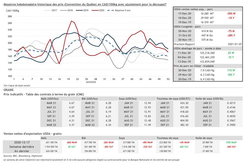 • Les contrats à terme sur le soya étaient également en hausse hier à Chicago. Les contrats de janvier, mars et mai 2021 ont terminé au-dessus de 12,90 USD/boisseau, se rapprochant tout près du cap de 13 USD/boisseau. La grève des inspecteurs de grains et des travailleurs des usines de trituration s’est terminée hier. Après avoir ralenti le trafic maritime pendant 20 jours, les travailleurs ont trouvé une entente avec le gouvernement. La grève a eu de grandes répercussions sur le transport des grains. Plus de 150 navires seraient toujours en attente de chargements en Argentine.