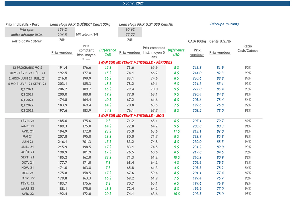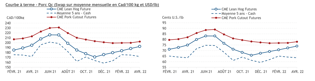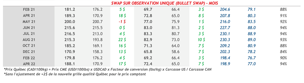 • Les contrats de porc ont terminé la journée en hausse hier pour toutes les échéances. Les contrats d’avril à octobre 2021 ont tous fait des gains au-dessus de 1 cent US/lb.