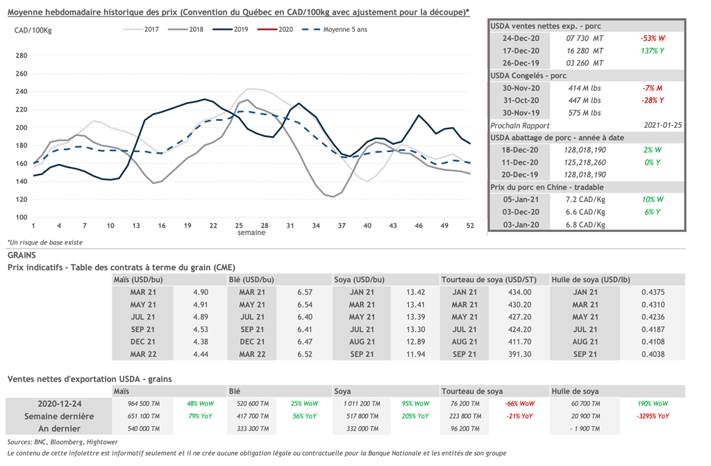 • Selon l’agence Bloomberg, la montée des prix des grains pourrait être en partie responsable de la hausse des prix du porc au cours des quatre dernières séances boursières. À titre d’exemple, le contrat de février 2021 s’est apprécié de 4,725 cents US/lb (+7,1%) durant cette période.
