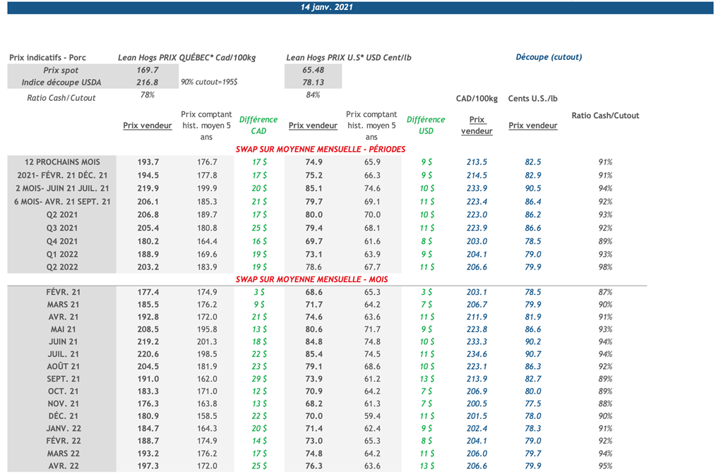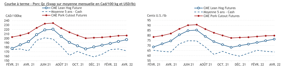 • Sur la journée d'hier, les contrats de porcs de février à mai 2021 était en baisse, surtout février de -1.65 cents US/lb. Les maturités étaient par contre à la hausse, frôlant +1 cent US/lb pour la plupart.