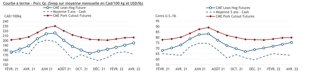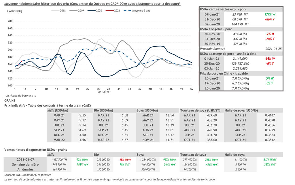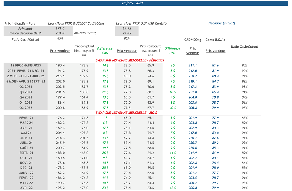 • Les contrats de porc ont subi une forte baisse hier et ont presque tous terminé dans le rouge. Les contrats de février, avril, juin, juillet et août 2021 ont perdu plus de 1 cent US/lb.