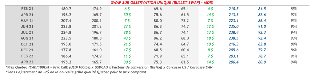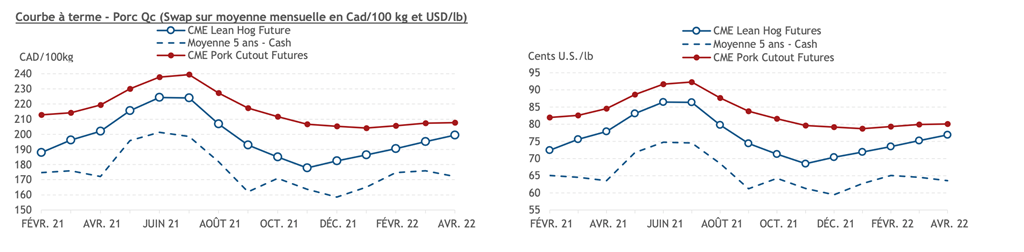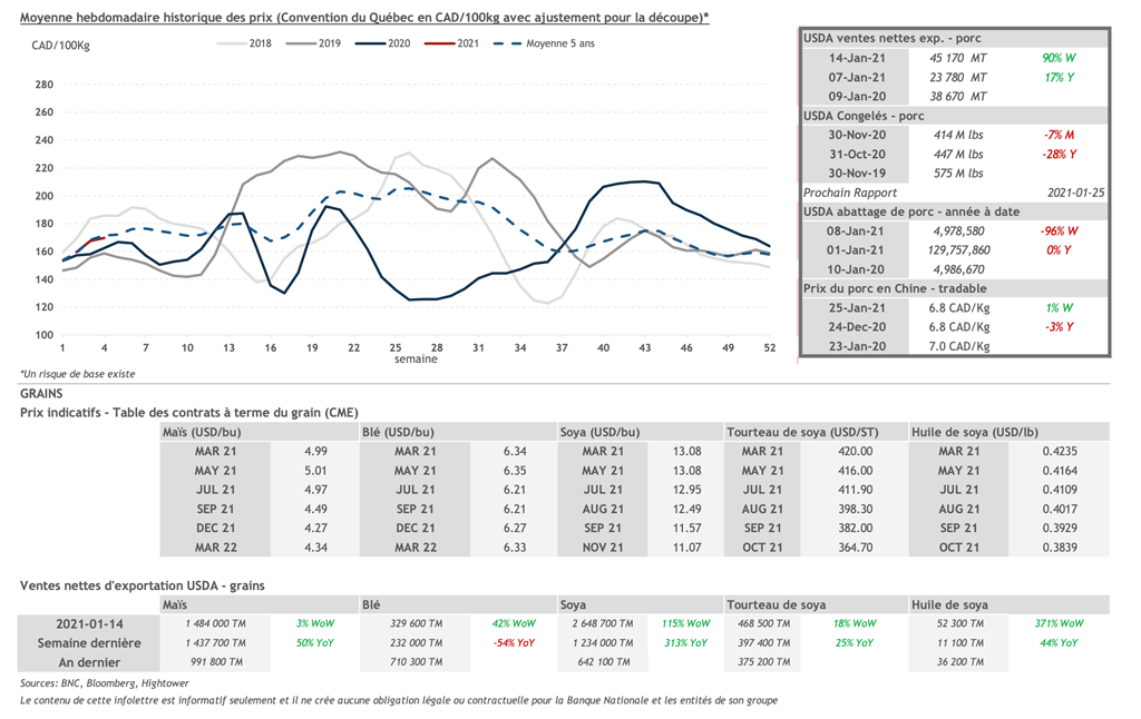 • Les prix des contrats de porc ont grimpé vendredi sauf pour les mois de déc.-21 à mai-22. Les mois de fév.-21 à oct.-21 ont gagné plus de 1 cent US/lb.