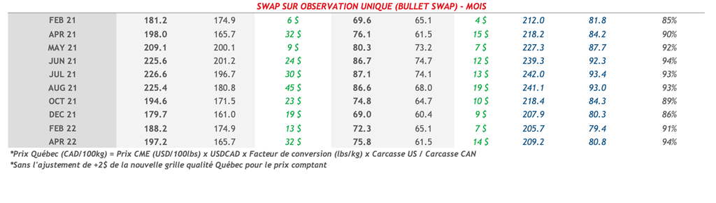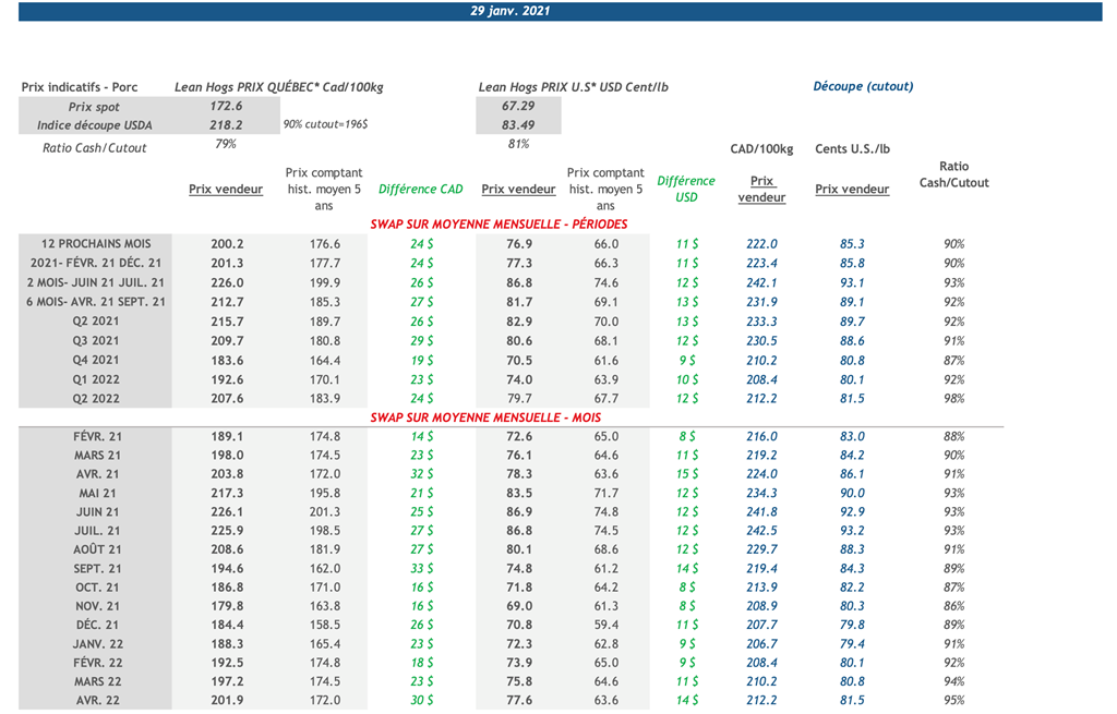 • Les contrats de porc ont terminé la journée d’hier en légère baisse pour les échéances à court terme (sauf le contrat d’avril) et en légère hausse pour les contrats à partir de l’échéance d’octobre 2021.