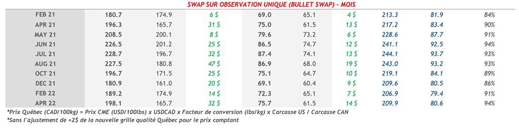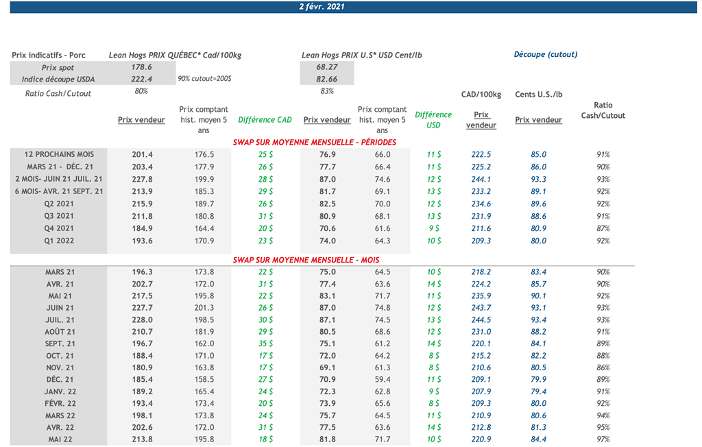 • Les contrats à terme sur du porc étaient en hausse hier sauf pour les mois de février à juin 2021. Le contrat d'avril-21 est celui qui pris un coup avec une baisse de 1.15 cents US/lb.