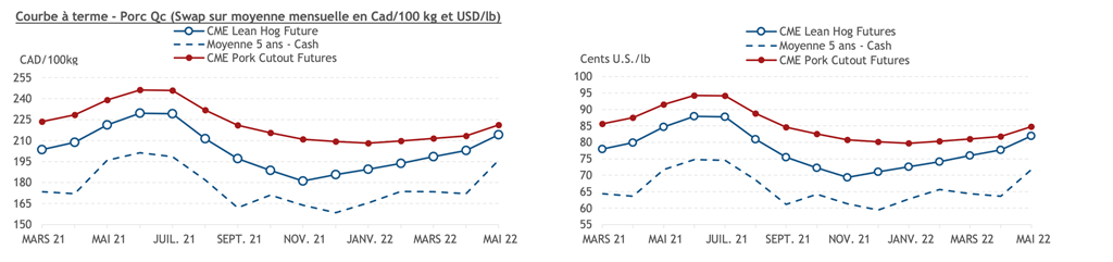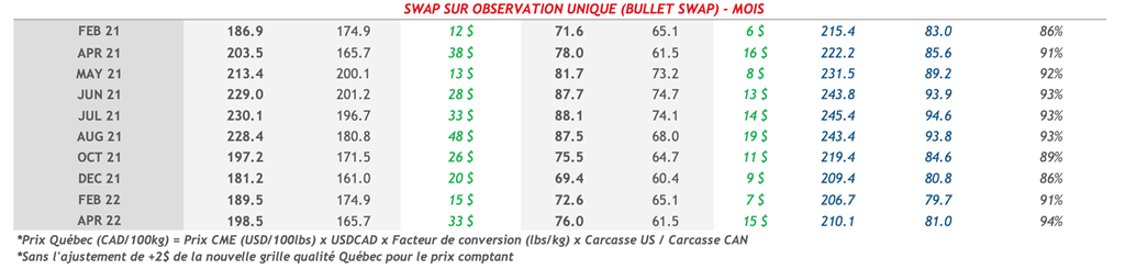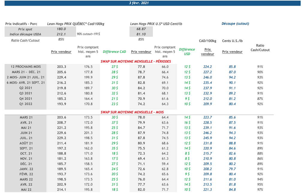 • Les contrats de porc étaient en hausse hier pour toutes les échéances. Les contrats de février et d’avril 2021 ont fait les plus grands gains, soit 2,00 (+2,9%) et 2,575 (+3,4%) cents US/lb respectivement.