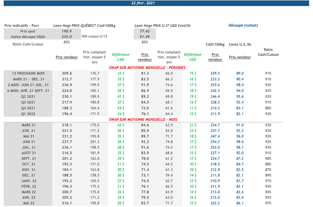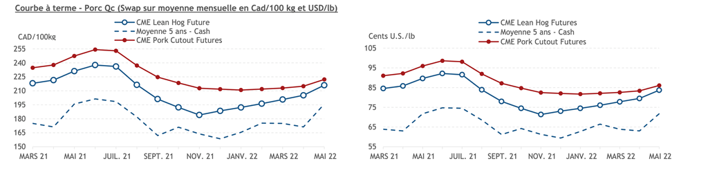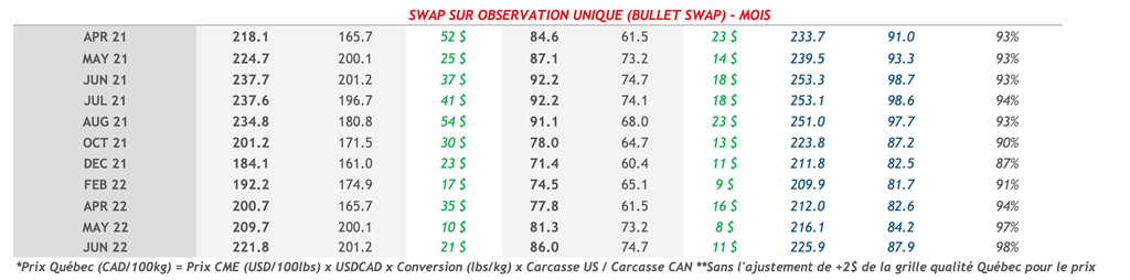 • Les contrats de porc étaient mixtes ce vendredi avec les échéances à court terme en légère baisse tandis que celle à plus long terme (octobre 2021 et plus) affichaient des gains.