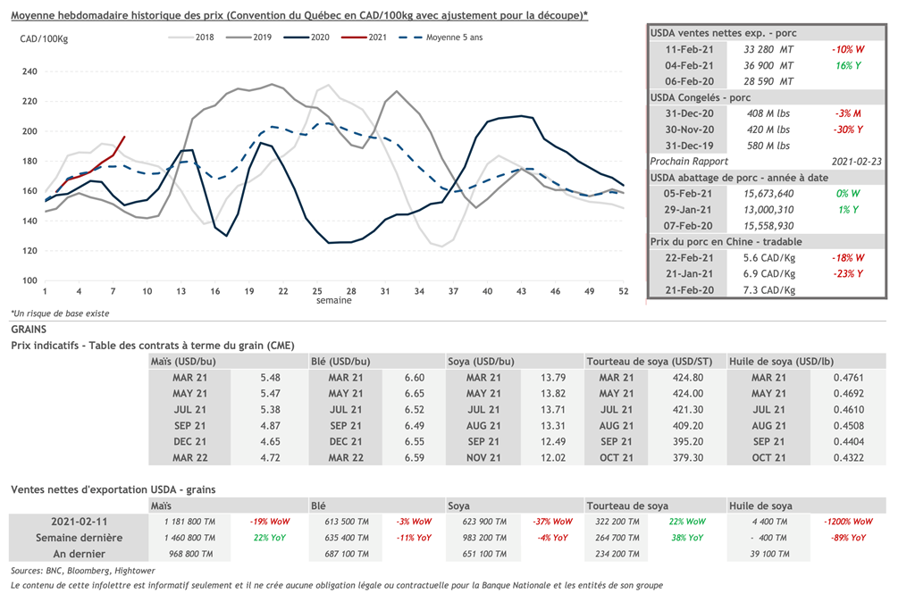 • 25 février : USDA — Ventes nettes d’exportations pour les grains et le porc