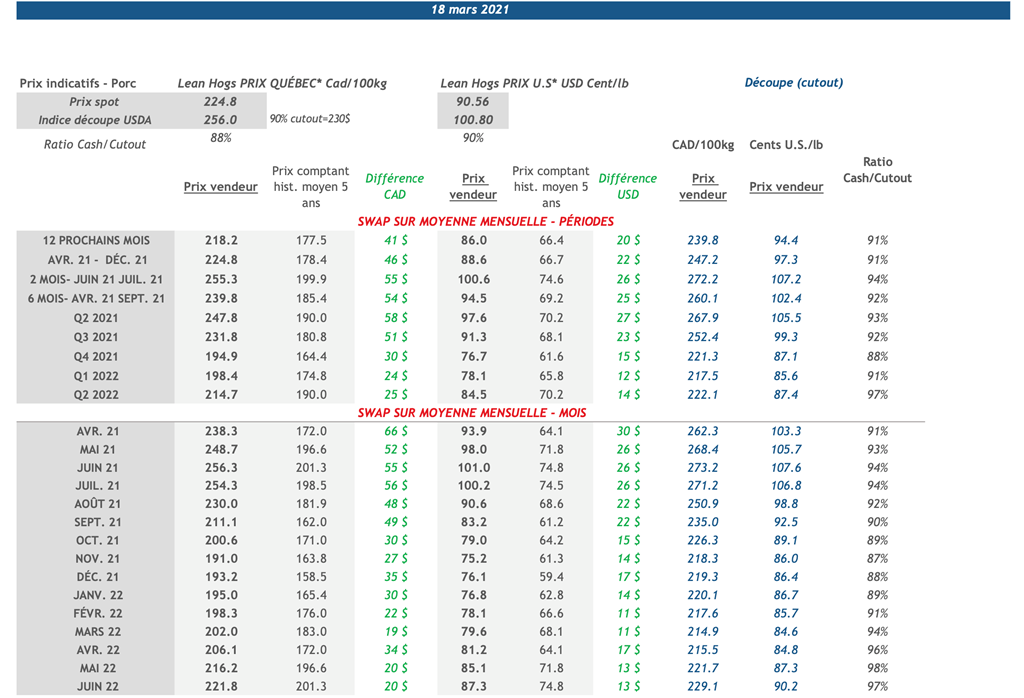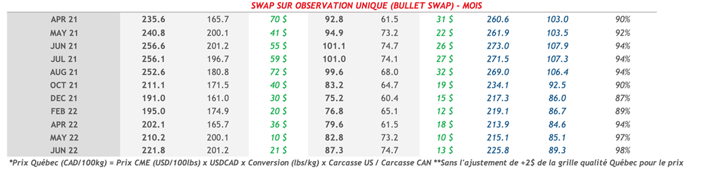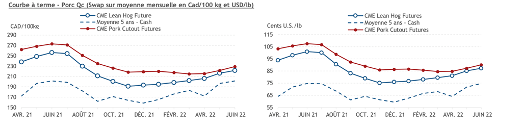 • La montée des prix du porc se poursuit. Les contrats d'été en US/lb sont plus élevés actuellement que les hauts de 2019 lorsque l'éclosion de la peste porcine africaine s'est réellement fait sentir. Le dollar canadien (0.8000) étant aussi fort ne permet pas au marché actuel d'atteindre les équivalents en CAD/100kg que l'on a vu en 2019 (0.7400) et les économistes n'anticipe pas une baisse de notre dollar d'ici la fin d'année.