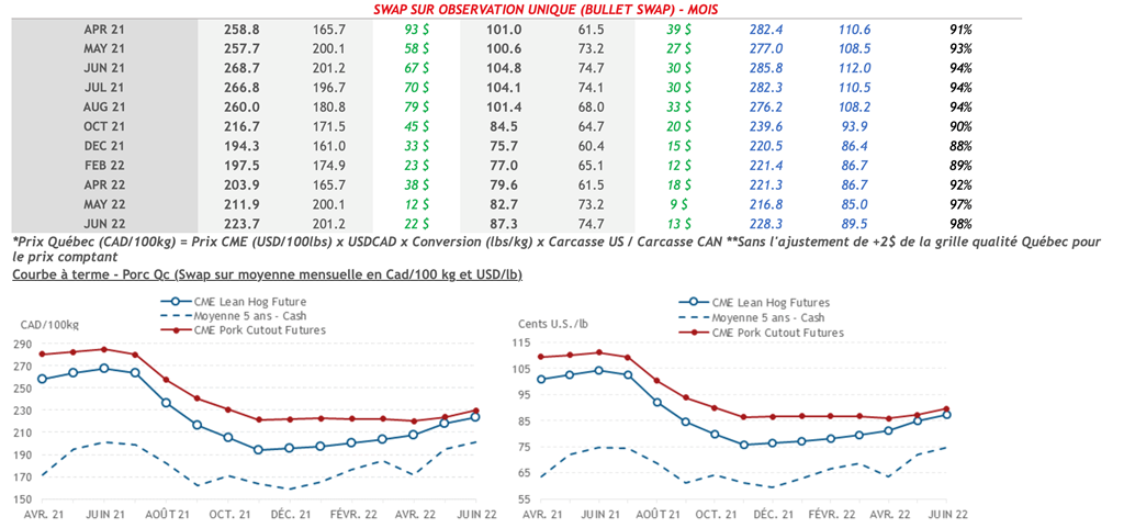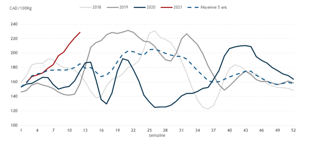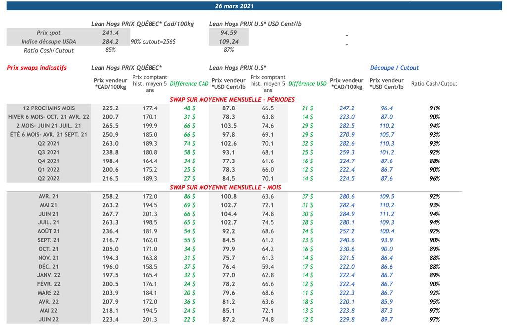• Les contrats de porc étaient en hausse pour toutes les échéances hier. Les échéances d'avril à juillet 2021 ont toutes fait des gains supérieurs à 1 US cent/lb avec le gain notable du contrat de mai 2021 de 2,025 cents US/lb.