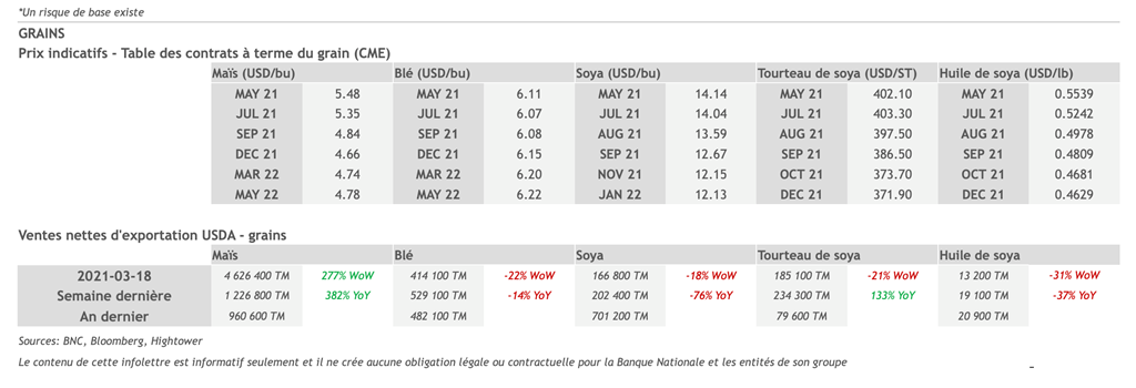 • 1 avril : USDA — Ventes nettes d’exportations pour les grains et le porc