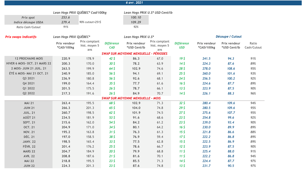 • L'indice du CME lean hog franchit enfin le niveau de 100 cents US/lb. Le prix s'est établi à 100,10 cents US/lb (+0.72 cents US/lb).