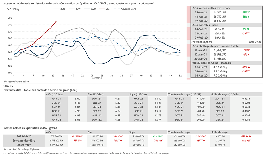 • 8 avril : USDA — Ventes nettes d’exportations pour les grains et le porc