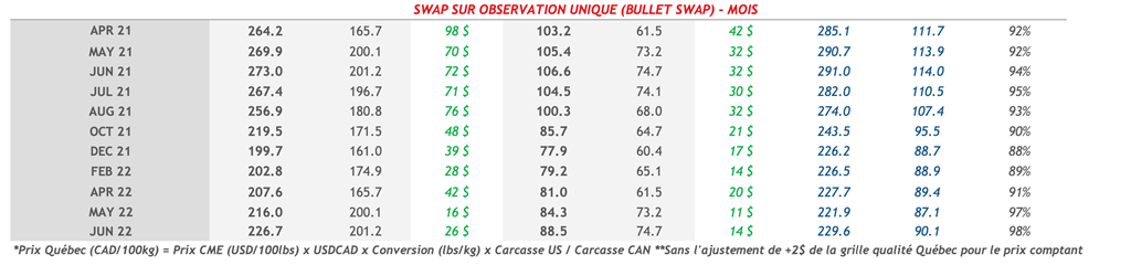 • Après une journée en forte baisse lundi, les contrats de porc ont fait de légers gains pour presque toutes les échéances hier. Seuls les contrats d’avril, juillet et août 2021 ont terminé dans le rouge. Les gains des autres contrats sont demeurés sous la barre de 1 cent US.