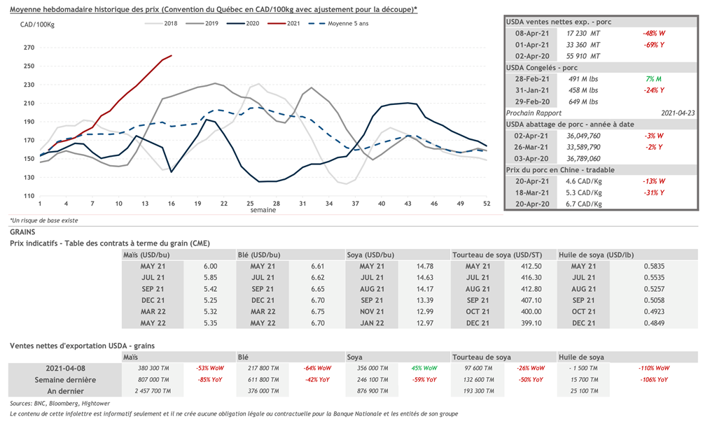 • 22 avril : USDA — Ventes nettes d’exportations pour les grains et le porc