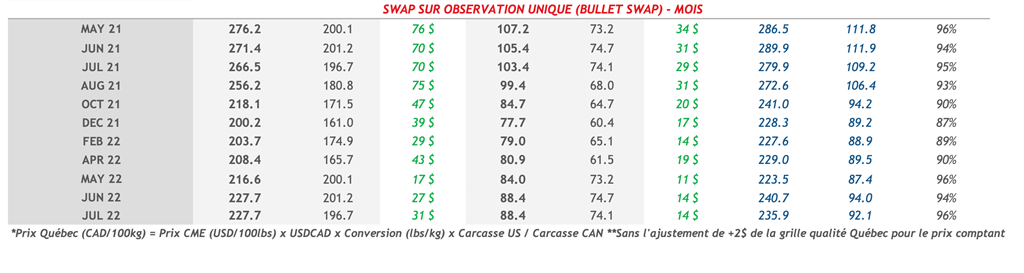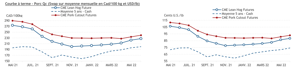 • Les contrats de porc ont continué de faire des gains hier pour une deuxième journée de suite. Les contrats de mai à juillet 2021 se sont appréciés de plus de 2 cents US/lb. La demande pour le porc demeure soutenue avec l’indice cash CME qui poursuit sa tendance haussière. L'indice atteint 104,42 US cents/lb ce matin.